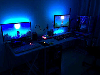 全体的なお部屋の照明は暖色系ですが、PC周りはライトの色が青系で統一されています。