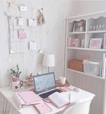 パソコン自体もかわいいですが、勉強グッズ、カップ、他のインテリアも全て落ち着いたかわいらしさがあります。