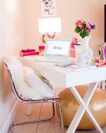 白い机に透明のイスで、それだけでもおしゃれですが、こちらは他の色とアイテムをプラスしています。