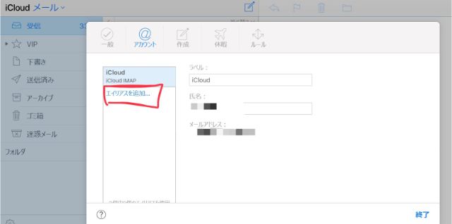 『アカウント』の設定画面内にある『エイリアスを追加』というところをクリックしてください。