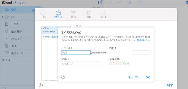 『@icloud.com』より前の文字列を入力し、続いて氏名、ラベル、ラベルの色を入力て、『OK』をクリックしましょう。これでメールエイリアスの作成が完了しました!