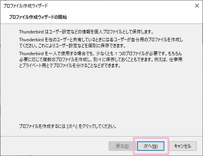 選択するフォルダですが、「コピーしたThunderbirdのフォルダ\Profiles\xxxxxx.default」を選択しましょう。その後「完了」をクリックしてプロファイルを作成したら、「Thunderbird - ユーザープロファイルの選択」を終了しましょう。