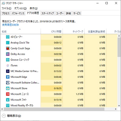 現在起動中のプログラムは「アプリ」として表示されるほか、バックグラウンドプロセスの一覧も表示されます。
