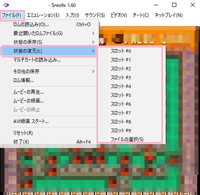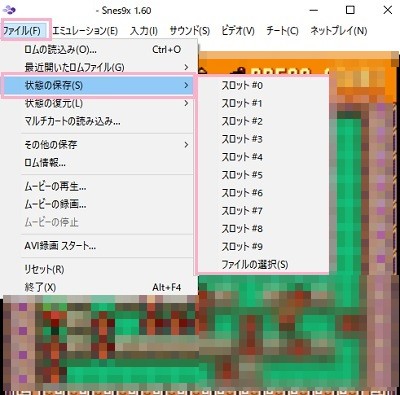 Snes9xでは、セーブ機能のないゲームであってもセーブすることのできるステートセーブ機能が搭載されています。「ファイル」メニューの「状態の保存」にマウスカーソルを乗せると、サブメニューに各種スロットが表示されるので保存したいスロットをクリックしましょう。現在のゲームの状態がそのままセーブされますよ。