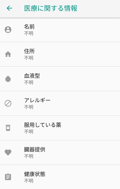 設定した項目は、自由に編集することができます。もし緊急情報を消したい場合は入力した項目を削除しましょう。ボタン式の選択項目は「不明」を選べばOKです。