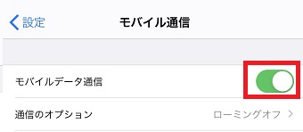 「モバイル通信」が開いたら「モバイルデーター通信」をオフにしてください。
