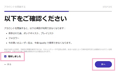 「以下をご確認ください」画面に、アカウント閉鎖することで保存された曲・ポッドキャスト・プレイリスト・フォロワー・ユーザー名が利用できなくなる旨が書かれています。確認したら「理解しました」をクリックしてチェックボックスを音にしてから「次へ」ボタンをクリックしましょう。