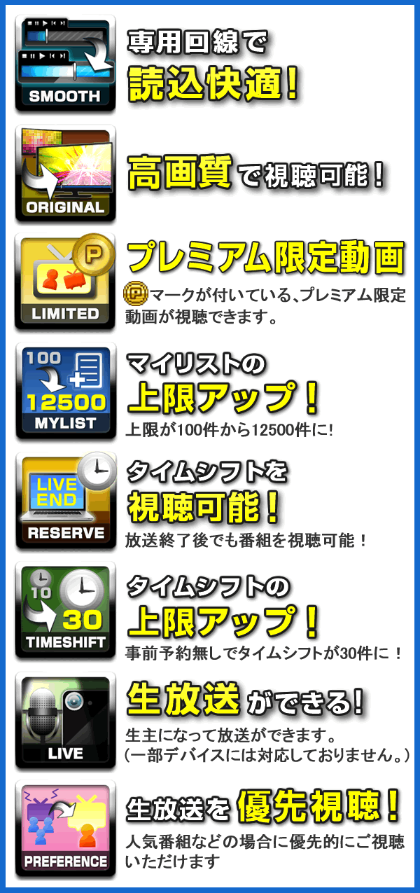 ちなみに、生放送を「見る側」ではなく、ニコ生主として「配信する側」になりたい方にも有料会員は便利です。パソコンが無くても生放送配信に対応しているスマートフォンがあれば、いつでもどこでも生放送が出来ます。 学生さんにもオススメ!