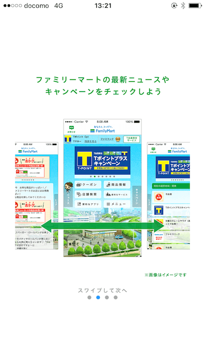 アプリを立ち上げて初回はアプリの使い方のチュートリアルが始まります。アプリの大体のイメージが掴めますので、最初は必ず見るようにしましょう。ここではスワイプすると最新ニュースやキャンペーンの情報が見れるという内容です!