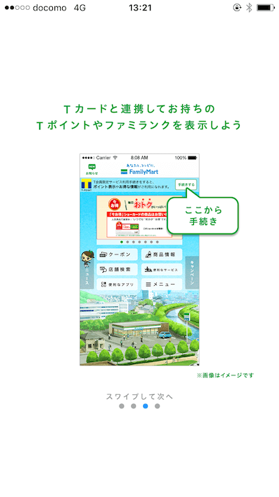 チュートリアルの続きです。Tカードと連携できるようです。Tカードと連携することで「Tポイント」や「ファミランク」の確認がファミリーマートアプリから出来るという内容になっています。