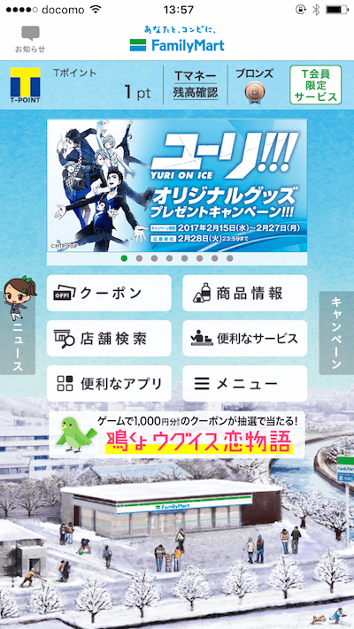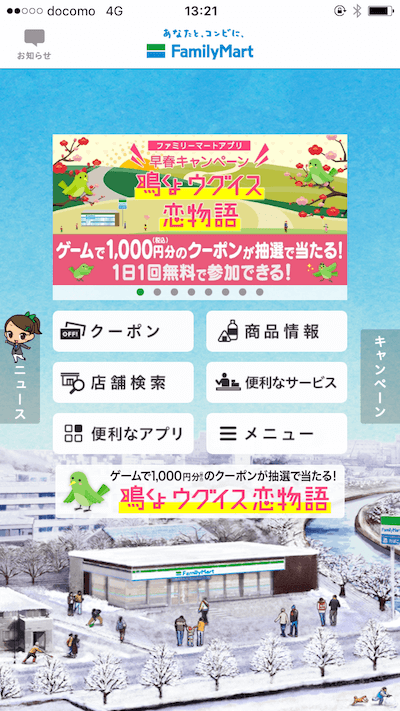 ファミリーマートアプリのトップページです。アプリのメインの機能である ・クーポン ・店舗検索 ・商品情報 ・便利なサービス ・キャンペーン ・ニュース ・便利なアプリ などのリンク(導線)が集まった内容となっています。全体のデザインが冬っぽい!
