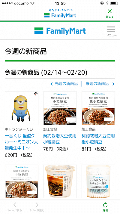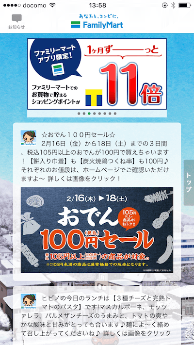 トップページから左にスワイプすることで、ニュースの一覧が表示されます。現在は「おでん100円セール」が実施されているようですね!このように何かセールがあったりするとニュースにのりますので、定期的にオトクな情報がないかチェックするといいかもしれません。