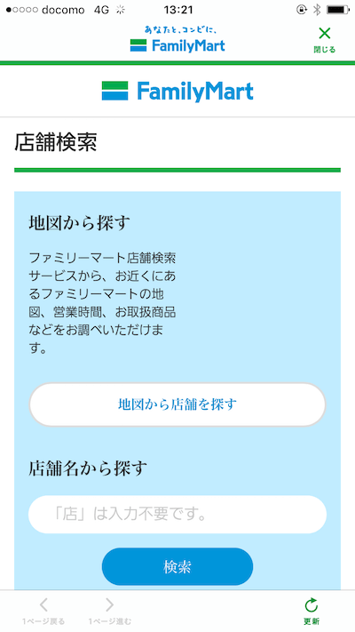 せっかくファミリーマートアプリを持っているのに近くのファミマを知らない・・・という場合にはまず店舗検索で店舗を探しましょう。 トップページのメニューから「店舗検索」を選択します。するとこのようなページが表示されます。フォントが一気に変わったのが気になりますが、こちらのページから ・地図 ・店舗名 からファミリーマートの店舗を探すことができます。
