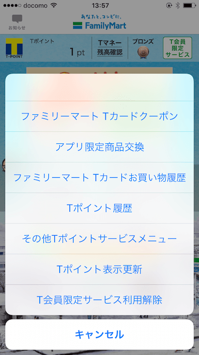 トップページの「T会員限定サービス」をタップすることでこちらのメニューが開きます。 ・ファミリーマートTカードクーポン ・アプリ限定商品交換 ・ファミリーマートTカードお買い物履歴 ・Tポイント履歴 ・Tポイント表示更新 など機能が拡張されます。