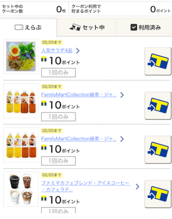 ファミリーマートアプリとTカード連携した場合にはT会員限定のアプリクーポンを利用できます。 期間と使用回数の制限がありますが、Tポイントがたまるものが多く、ぜひ利用するようにしましょう。