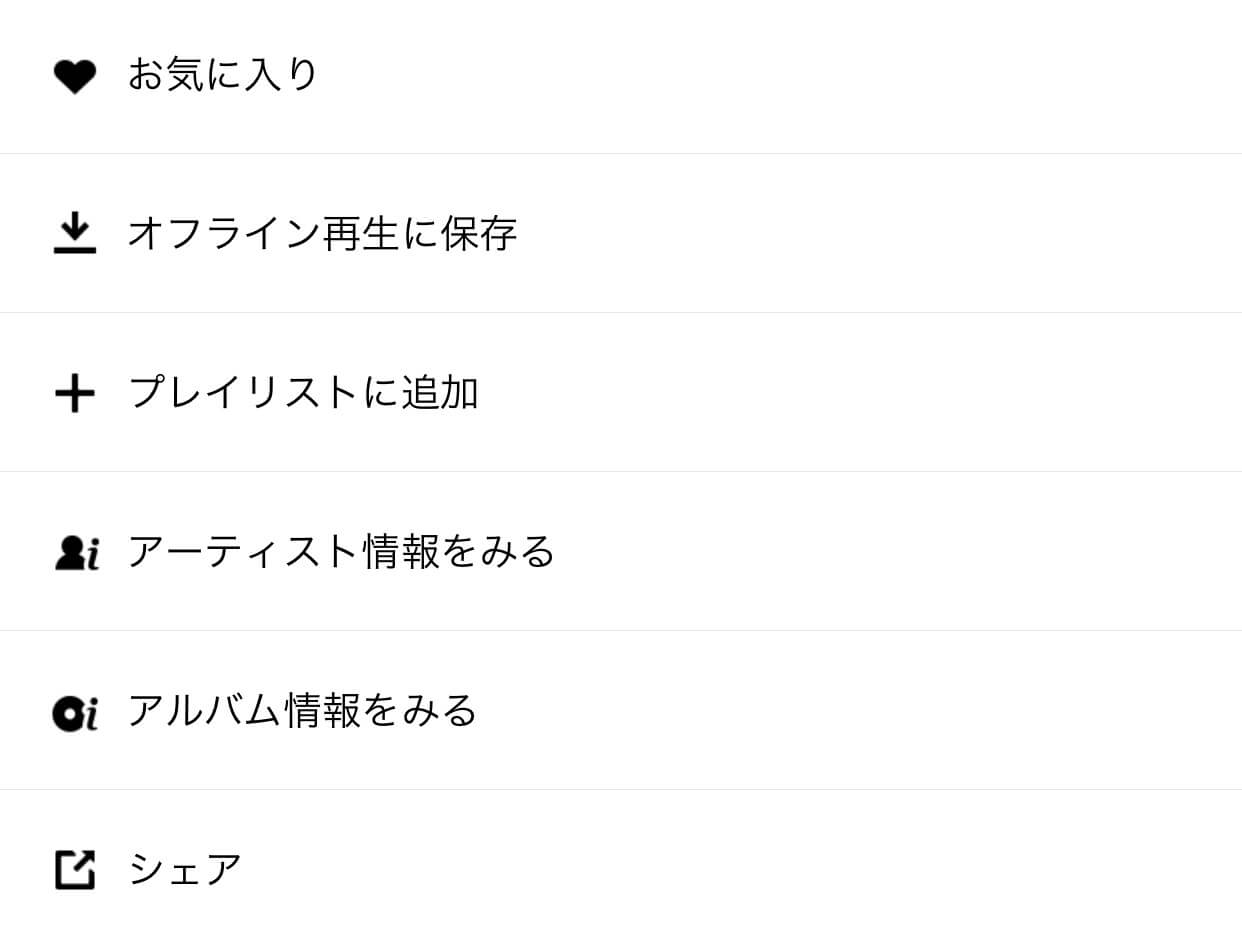 シェアに関しては、お気に入りの楽曲を選択し、右側の[…]内の 下記にシェアボタンが設けられております。 シェアできるのは、LINE(トーク)・LINE(タイムライン) Twitter・Facebookが対応しております。 LINE上でシェアされた曲が再生出来るのは 裏技に入るのでしょうか?わかりませんが便利です。 契約していない方も曲の一部が再生出来るので、 さわりだけでも聴いて好きか嫌いか判断できます。 その他、お気に入りやマイアーティストも 登録することもが出来るので、もう一度聴きたい楽曲に 出会ったのであれば、すかさずチェックしましょう!
