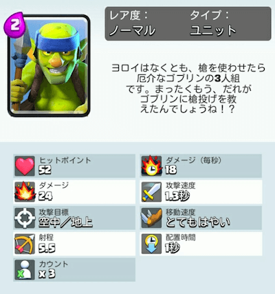 空中/地上と両対応の槍を投げるゴブリンを3体召喚します。攻撃力・攻撃速度こそ後述のゴブリンには及びませんが、遠距離から槍の攻撃ができるので、相手タワーに確実に(だけど少し)ダメージをあたえたいときなど削るのを得意としています。 コスト2で召喚できるので、相手の単体攻撃のカードに対する防御としても使えそうです。
