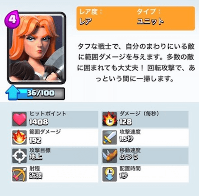 バルキリーは本家クラッシュオブクランと同じく回転攻撃でバルキリーの周囲の敵を一層します。スケルトン部隊の真ん中に配置して、ゴブリンを一層したり、さきほどのゴブリンも一撃で倒すことが可能です。 更にそこそこHPもあるため盾としても利用することができます。一方で相手タワーを攻撃するには移動速度がやや不安な面があるため 後衛にホグライダーなどスピードの早いカードを配置して「エスカレーター」を狙うなど工夫すると効果的です。