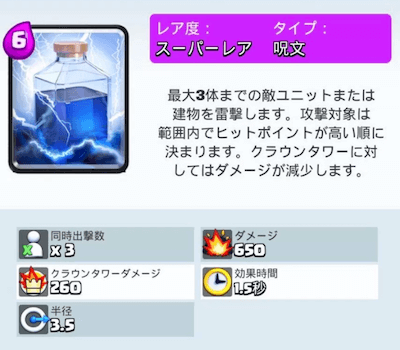 ライトニングはスーパーレアカードでゲットできる確率は低いですが、とても強力な呪文です!最大3体のユニットと建物を攻撃します!攻撃の順番はヒットポイントの高い順になります。特にライトニングはHPがそこそこのユニットであるウィザードやマスケット銃士などに効果的で、一撃で倒す威力を持っています。 更に一時的に敵をスタンさせるので、スパーキーなど攻撃に溜めが必要なカードにも有効です。ただしコストが6であることと攻撃が順番があることなどからある程度慣れが必要な呪文でもあります。 ライトニングを使ったおすすめデッキをご紹介!