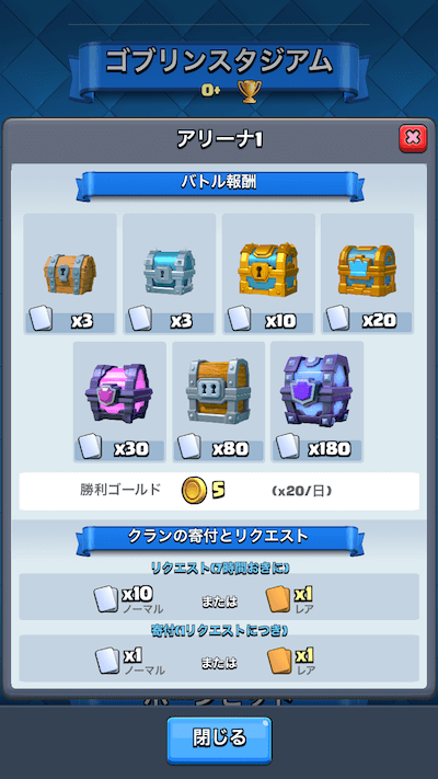 アリーナ1 ゴブリンスタジアムはトロフィー帯でいうと「0+」つまり0以上が対象となります。最初のステージなので0となっています。 また勝利ゴールド(勝利報酬)は5ゴールドとなっています。こちらは制限があり1日に20回のみ勝利ゴールドを受け取ることができます。 次にクランに対する寄付ですが ・リクエストはノーマルカードx10枚またはレアカードx1枚可能 ・寄付は1リクエストにつきノーマルカードx1またはレアカードx1枚可能 となっています。最初のステージだけあって、まだ枚数は少ないですが、もともと持っているカードもそれほど多くないので大量の寄付はできません。