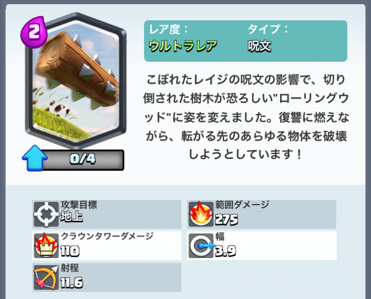 ローリングウッド一発でスケルトン部隊やゴブリンなどは全滅します。またウルトラレアカード「プリンセス」は射程が長くやっかいなカードですが、ローリングウッド一発で処理することが可能です。 (もちろんレベル差により一発ではない場合もあります)