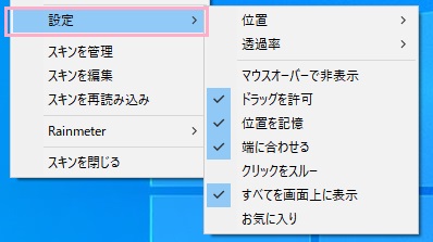 - 位置を記憶:ウィンドウが置かれていた位置を記憶して、Rainmeterの起動時に同じ位置にウィンドウを表示します。
