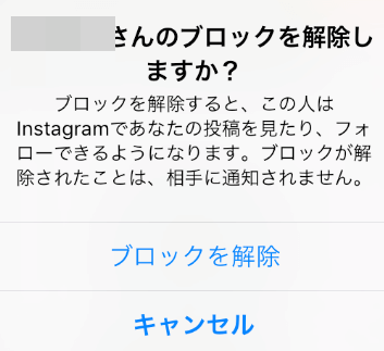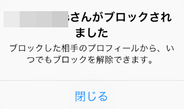 ブロックが完了するとこのようなポップアップが表示されます。ここに書いてある通りブロックしたユーザーはいつでも解除できます。