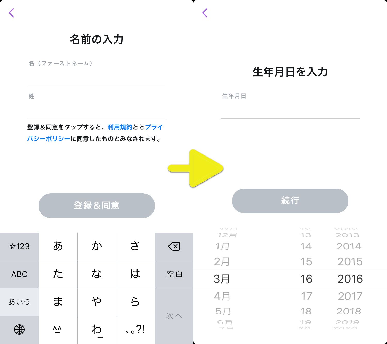 名前、生年月日を入力します。 名前はフレンドとやりとりする際に表示されるもので、後からでも変更可能です。