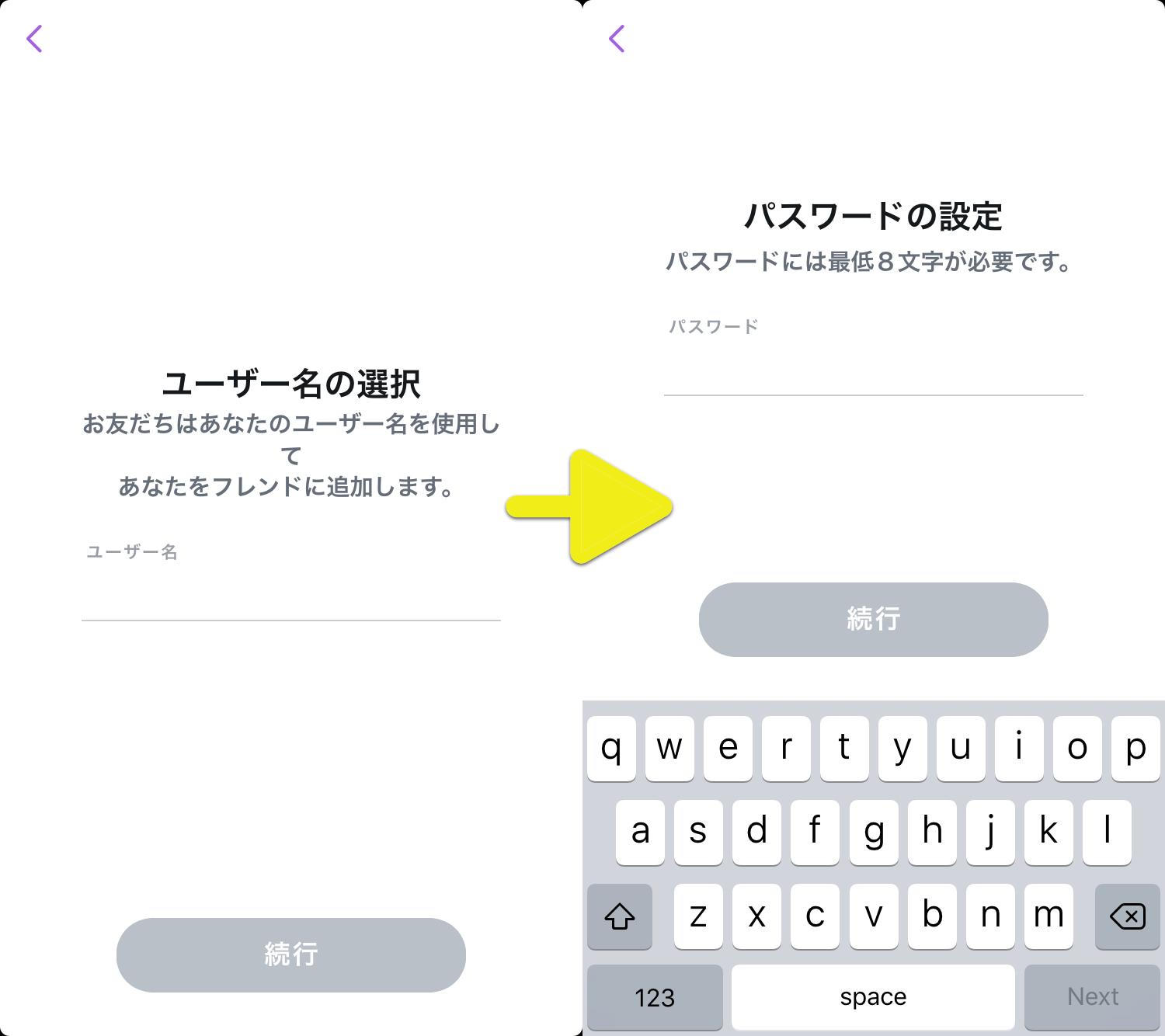つづいてユーザー名、パスワードを入力します。 ユーザー名はアカウントのIDになるので、他の人とかぶるものは使用できません。 また、こちらは後から変更することもできないので気をつけましょう。