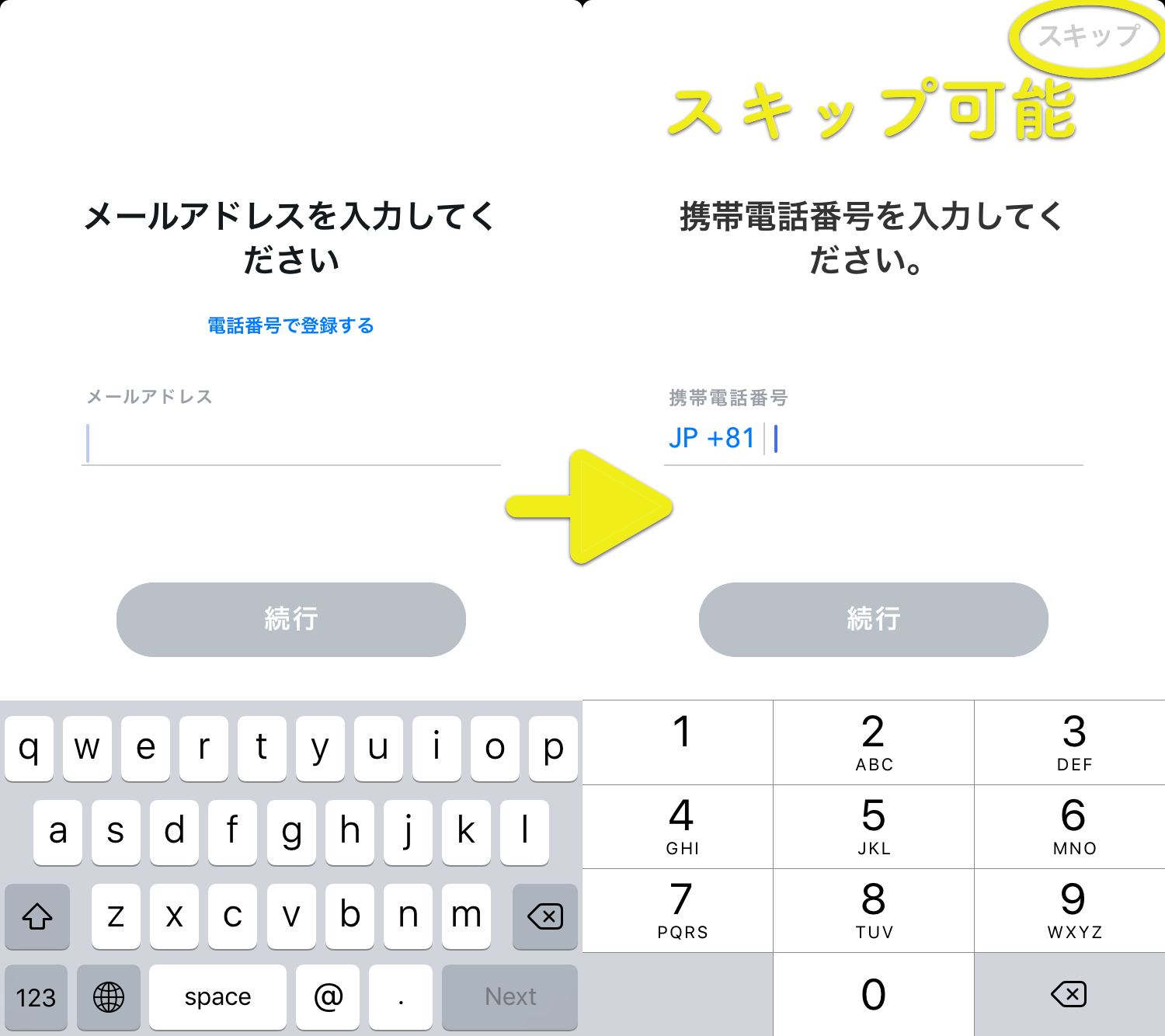 次にメールアドレスと携帯電話番号の入力です。 電話番号は、画面右上の「スキップ」からスキップも可能ですし、後から入力することもできます。