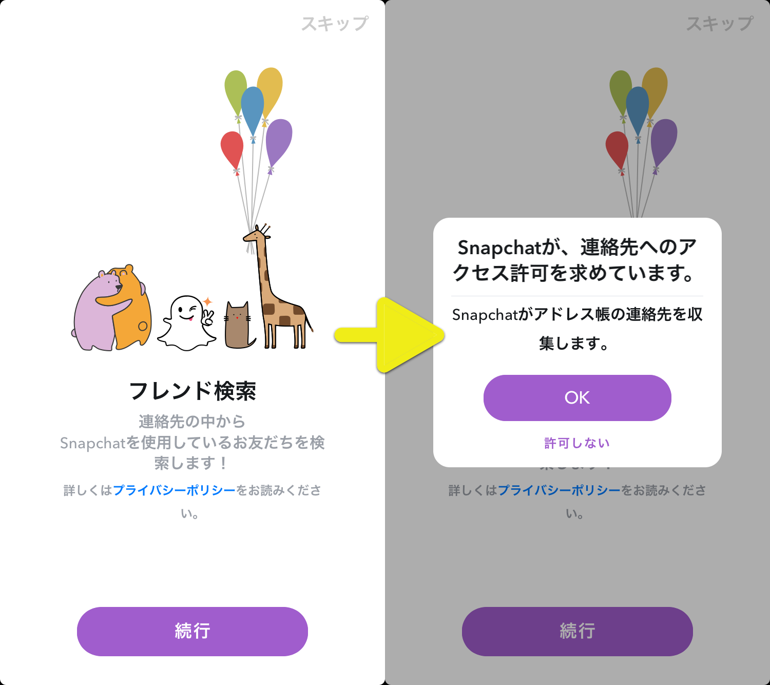 最後に、連絡先へのアクセス許可です。 Snapchatを使っているフレンドを検索して、見つけるための設定になります。 こちらも画面右上表示からスキップできますし、後から変更もできます。