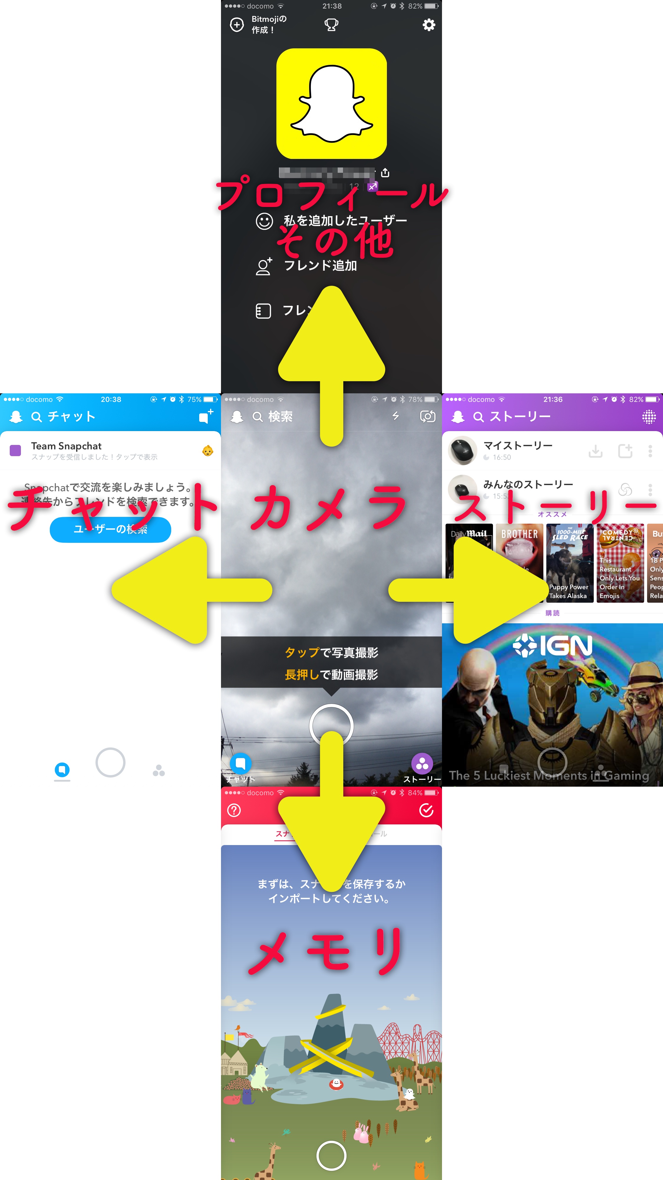 Snapchatはこのカメラ画面を中心にして、主な機能が上下左右に置かれています。 大きくわけて5つの機能=5つのスクリーンで作られている、とおぼえるとわかりやすいと思います。 それぞれの画面は「スワイプ」か画面下部の「アイコンをタッチ」することで移動できます。