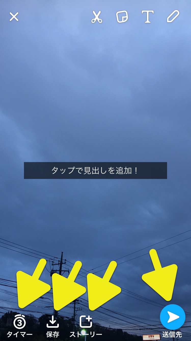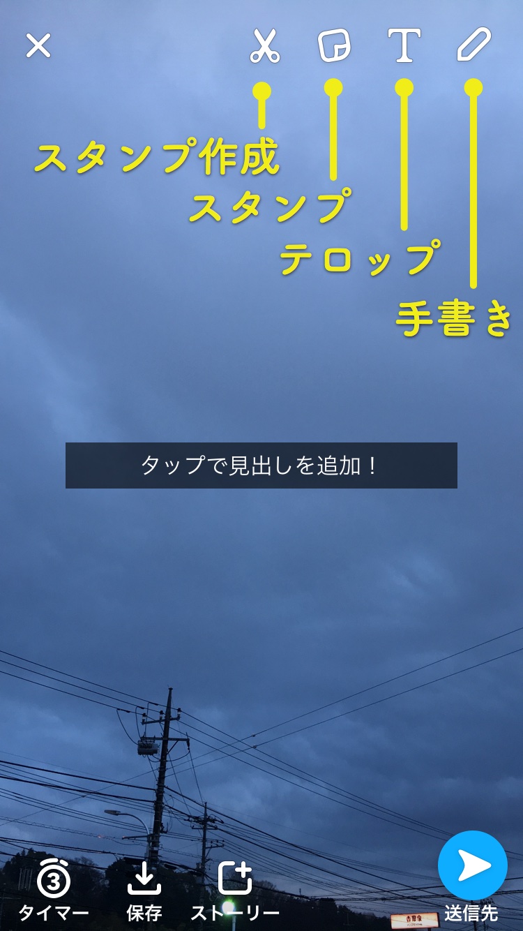 | 送信先 | フレンドを選んで写真、動画を送信します。ストーリーへと同時に公開することもできます。 |
