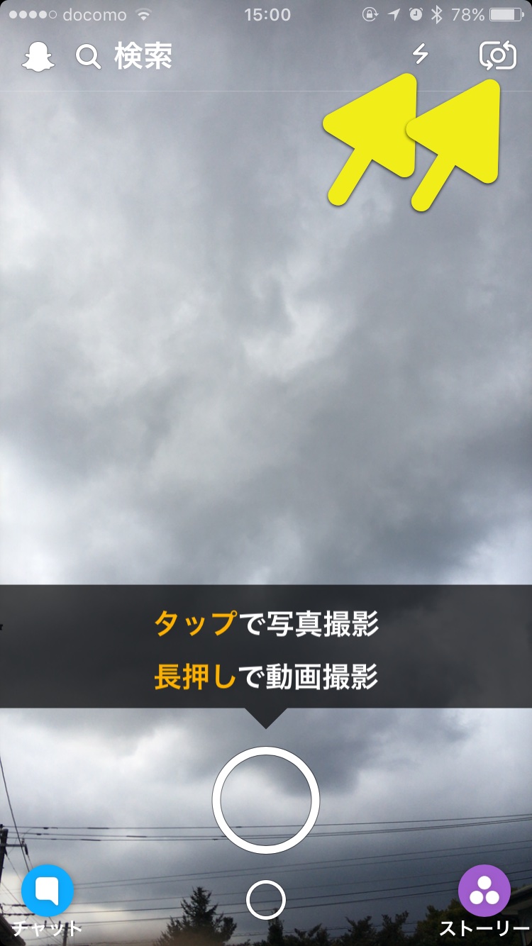 右上のアイコンで、フラッシュのON/OFFと、撮影に使うカメラの内側/外側を切り替えます。 ちなみに、カメラ切り替えは画面をダブルタップすることでも可能なので、おぼえておくと便利です!