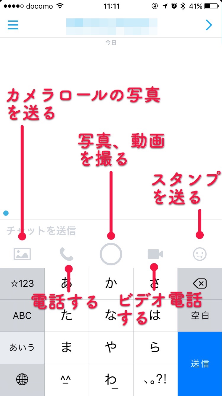 チャットでは、メッセージの送信以外にその場で写真を撮影したり、電話やビデオ電話もできます。