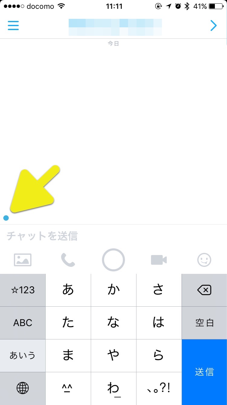 相手もチャット画面を開いている場合は、画面の左下に青い丸が表示されます。