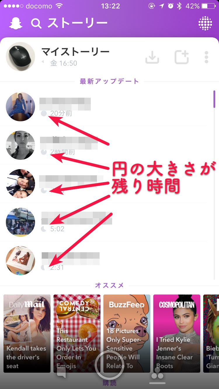 他のSNSのタイムラインにも似ていますが、Snapchatでは投稿がフレンドごとに分かれています。