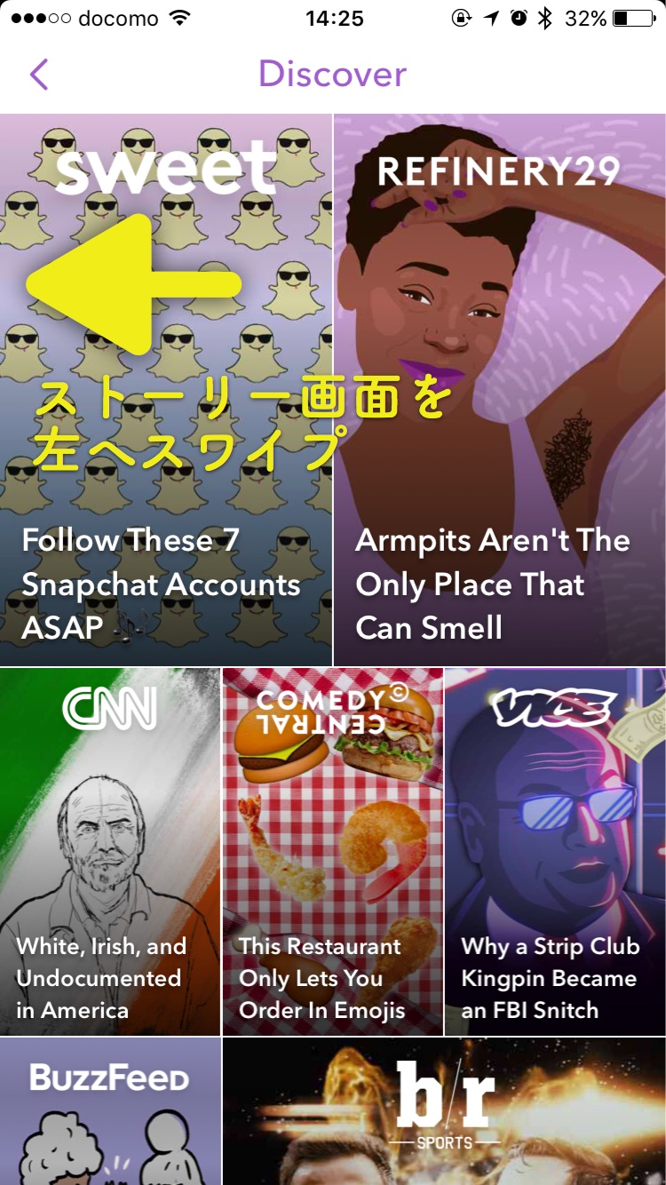 ストーリー画面下にある「オススメ」や、ストーリー画面を右端から左へスワイプすると表示される「Discover」には、アメリカの有名メディアのアカウントが配置されています。 全て英語ですが、凝った作りの動画も多く、内容も毎日更新されるので見るだけでも楽しいです。
