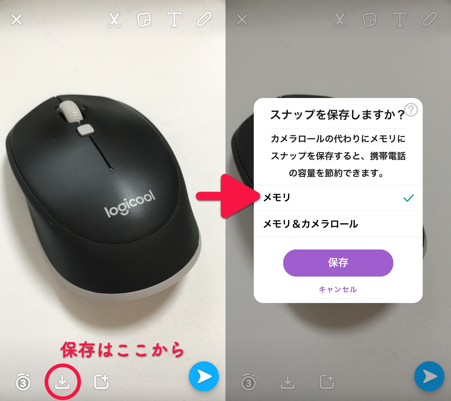 投稿時に左の画像の赤い丸で囲んだアイコンをタップすると、保存することができます。 保存先をメモリにするかカメラロールにするかは、後から設定で変えることもできます。