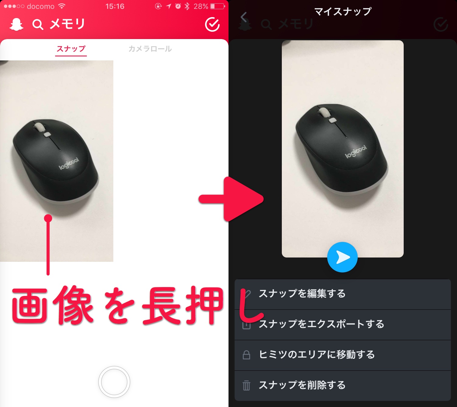 | 保存 | 誰かに送った写真はその後消えますが、投稿者だけ保存しておくことができます。 保存先は、スマホのカメラロールか、Snapchat上のメモリか、その両方かを設定できます。 |