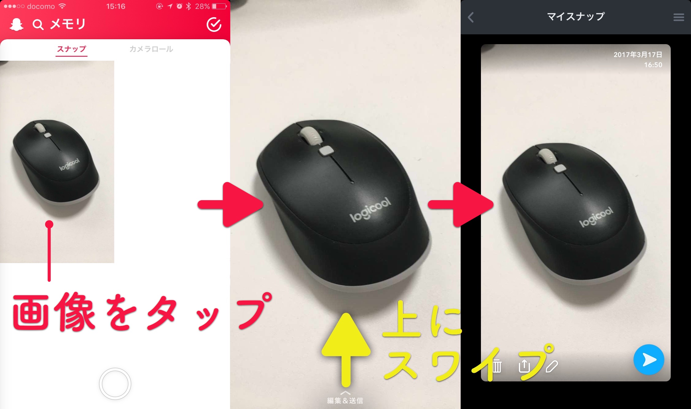 メモリとカメラロールにある写真/動画をタップで拡大表示させた後、上にスワイプすると編集や送信も可能です。