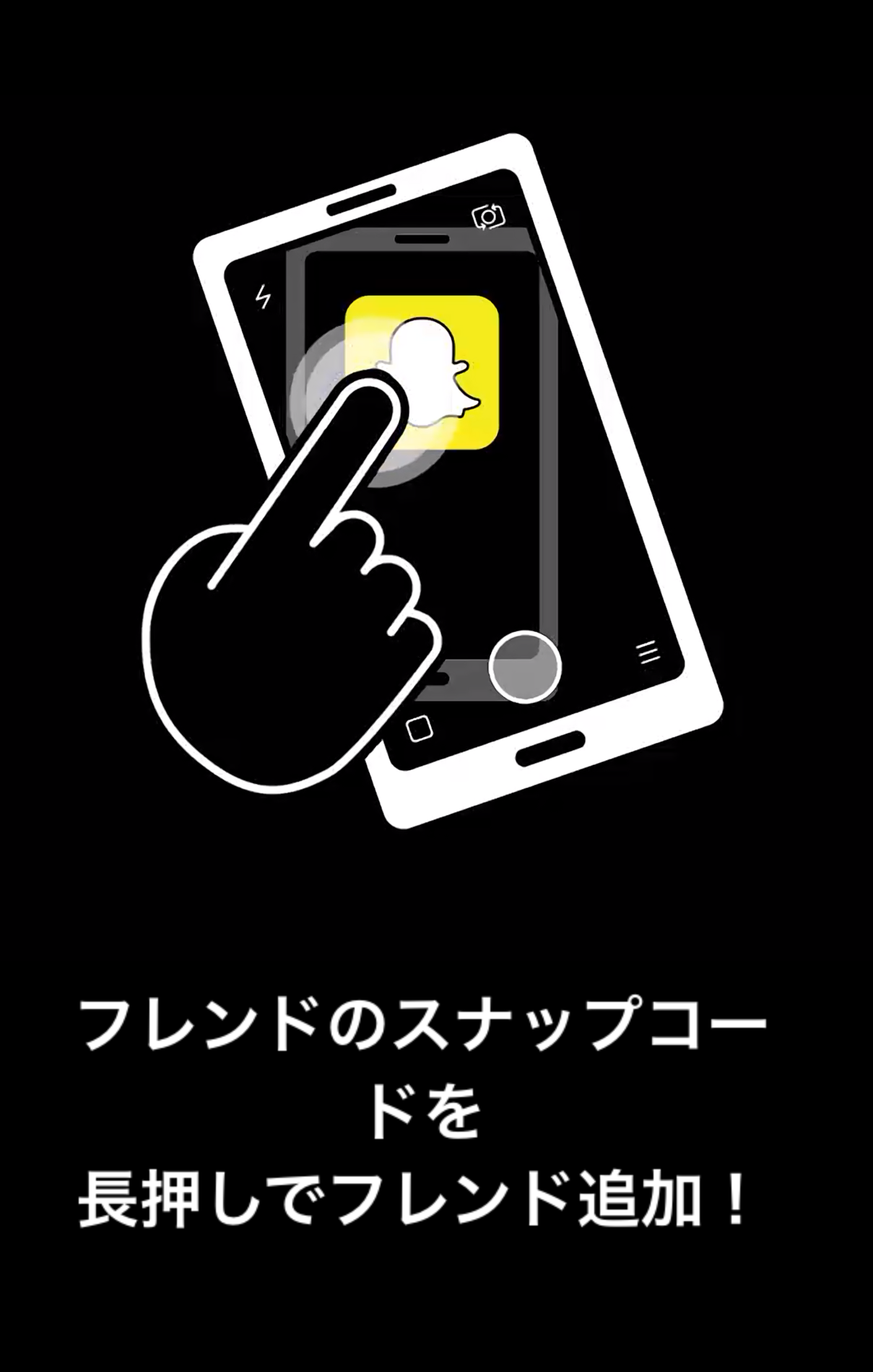 このスナップコードをSnapchatのカメラに映して長押しすると、簡単にフレンド追加ができるのです。 また、スナップコードが映った画像をカメラロールから読み込む(プロフィール画面で「フレンド追加」→「スナップコード」→「カメラロールから画像を選択」)ことでも、フレンド追加できます。