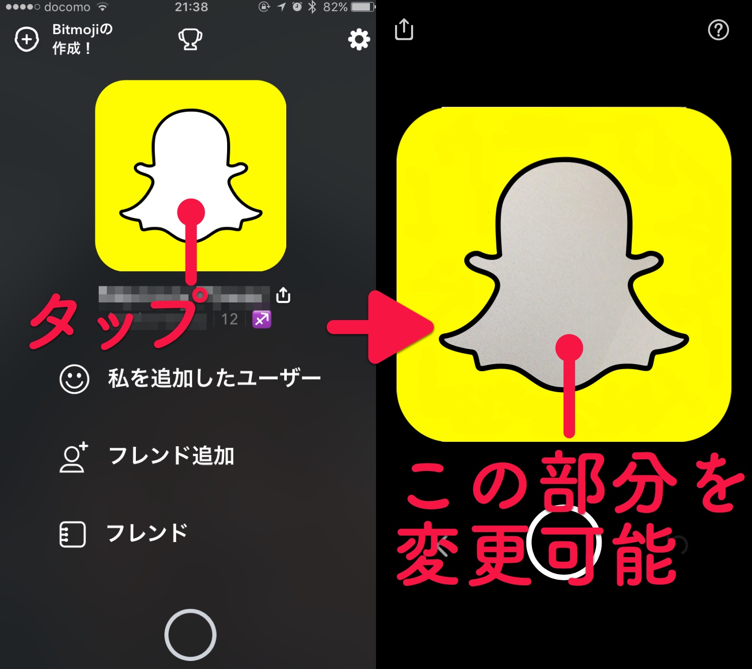 また、このスナップコードをタップすると、真ん中のお化けの部分に表示する動画の撮影モードになります。