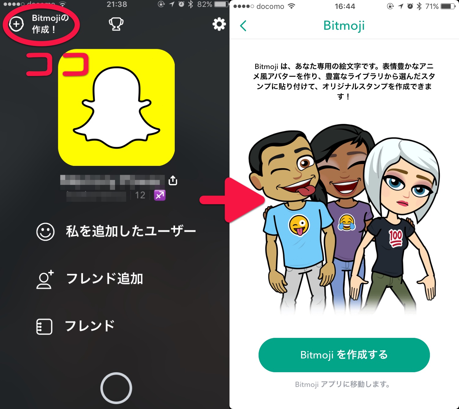 左上の「Bitmojiの作成!」は、別のアプリを起動してBitmojiというオリジナルのアバタースタンプを作成します。