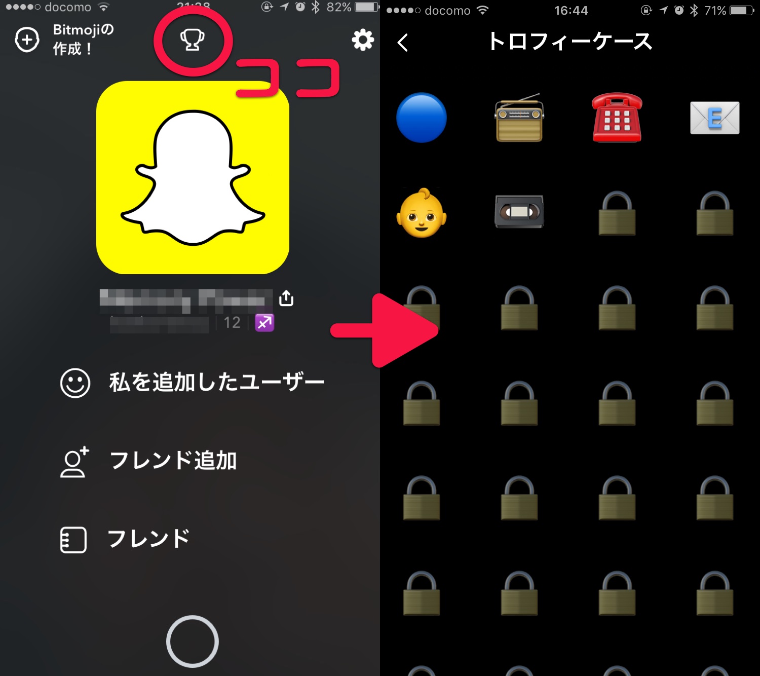 トロフィーのアイコンをタッチすると、Snapchatをたくさん使うほどに得られるさまざまなトロフィーが表示されます。