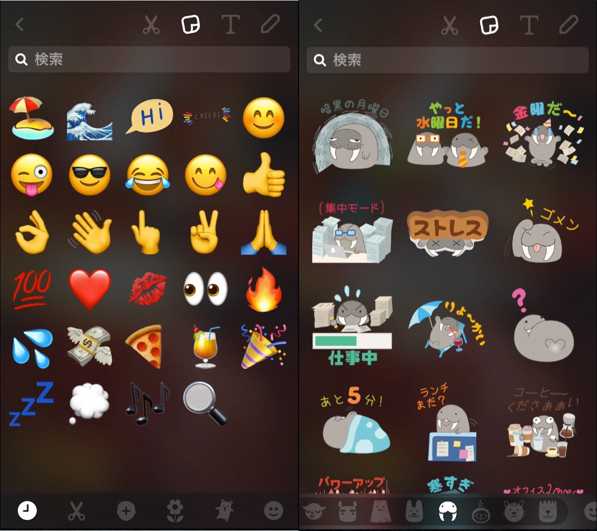 スタンプアイコンをタップすると、スタンプの選択画面に切り替わります。 画面の下部にある、スタンプのカテゴリリストを切り替えながら使いたいスタンプを選びましょう。