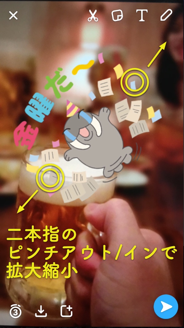 また、スタンプを二本指でタッチして回せば回転、ピンチアウト/インすれば拡大縮小もできます。