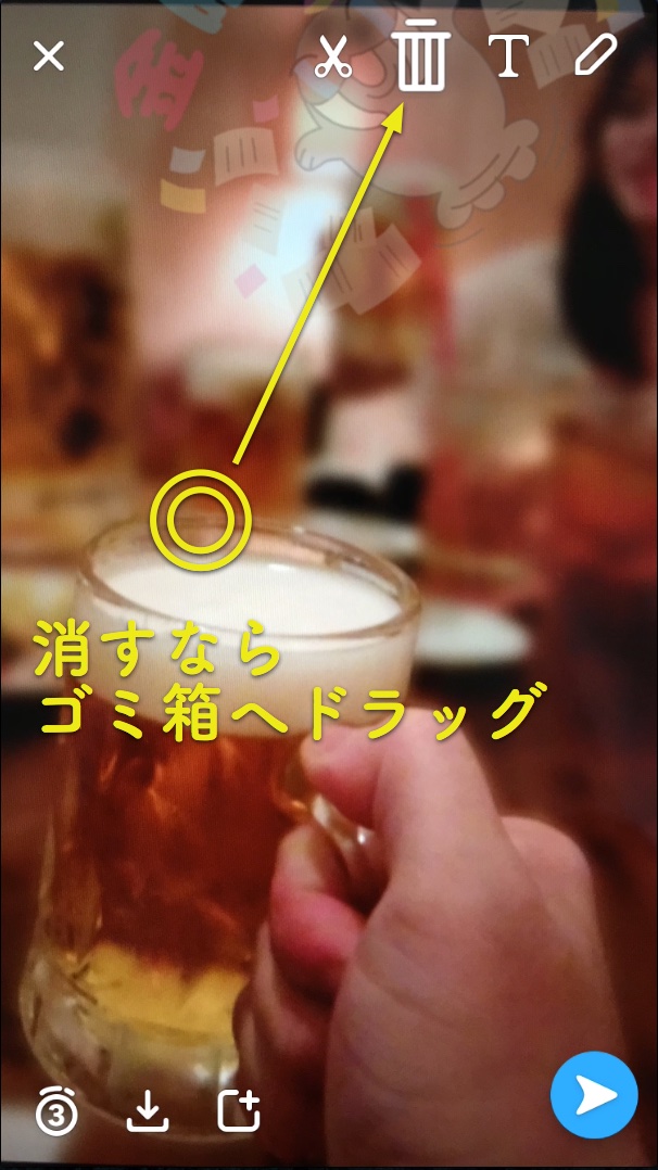 ドラッグ中は、画面上部のスタンプアイコンがゴミ箱アイコンになります。 スタンプを消したい時は、そのままドラッグしてゴミ箱アイコンの上に重ねると、削除することができます。