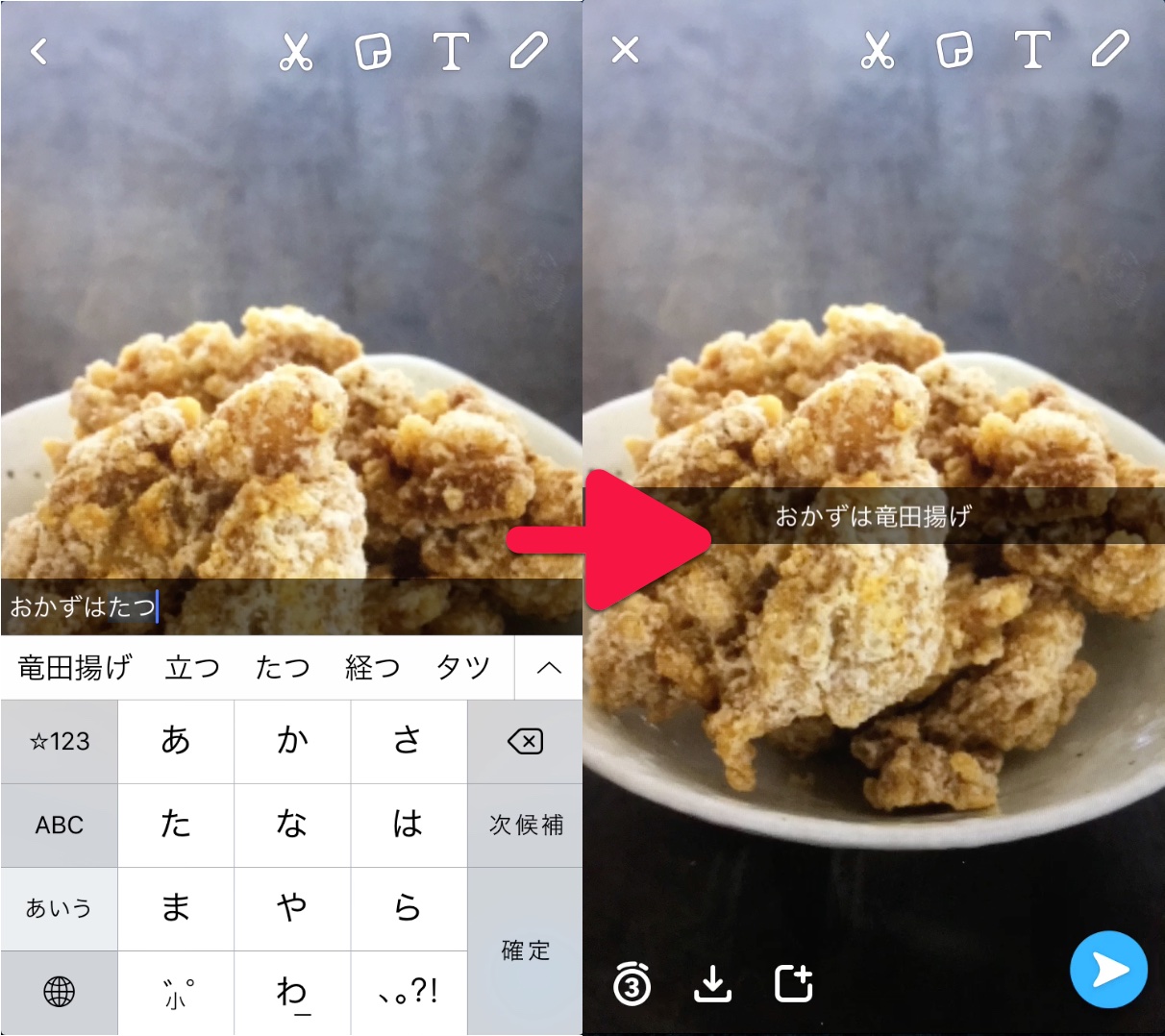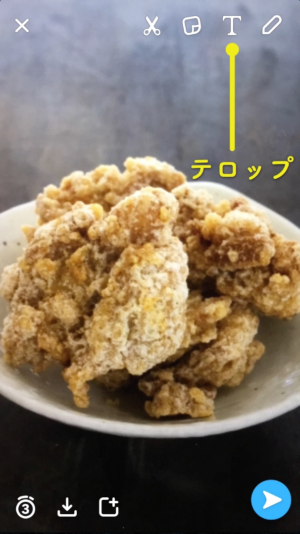 テロップを追加するには、左の写真で指している「T」のアイコンをタップするとテロップ入力モードになります。