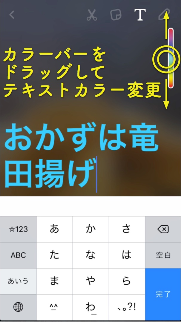 左揃え、中央揃えの状態で、テロップをタップするとテキストカラーも変更できます。 画面右上のカラーバーをタッチして、上下にドラッグすることでテキストの色が変わります。